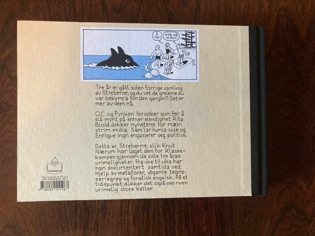 Dette er Streberne, slik Knut Nærum har laget den for Klassekampen gjennom de siste tre åras urimeligheter. Fra uke til uke har han dokumentert samtida ved hjelp av metaforer, utgamle tegneseriegrep og fonetisk engelsk. På et tidspunkt dukker det også opp noen urimelig store katter.