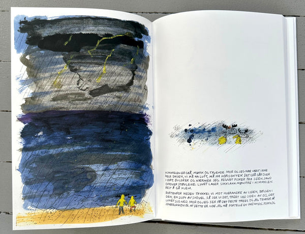 "en illustrert bok for voksne (men som visuell opplevelse er den fin for alle), og handler om jegets forhold til havet og moren. Symbolikken hav og moderskap/ symbiose/adskillelse fungerer fint i denne såre fortellingen, der sort og blå skrift følger litt forskjellige tematiske linjer. Den sorte omhandler havet og dets skapninger, den blå er minnebilder fra barndommen. Som alltid er Fiske også humoristisk (hovedpersonen er feks en elskelig elg, måtte grunne litt over dette valget, haha!), og nettopp det gjør den gjennomgående sorgfølelsen mer berørende for leseren. For den lille og etterhvert voksne fortelleren når ikke helt frem til moren. Hun har nærmest en følelse av å være i veien. Som voksen kjenner hun på mørket i seg. Men havet er tryggheten, beskyttelse og glede. Kjenner meg igjen i dette! Det skjøre og fine visuelle uttrykket i boka - sort penn og akvarell - balanserer som teksten mellom det lettbente og tyngre, morsomme og triste/ mørke. En visuell glede! og fint om hav, vemod, tilknytning og et eget sted."